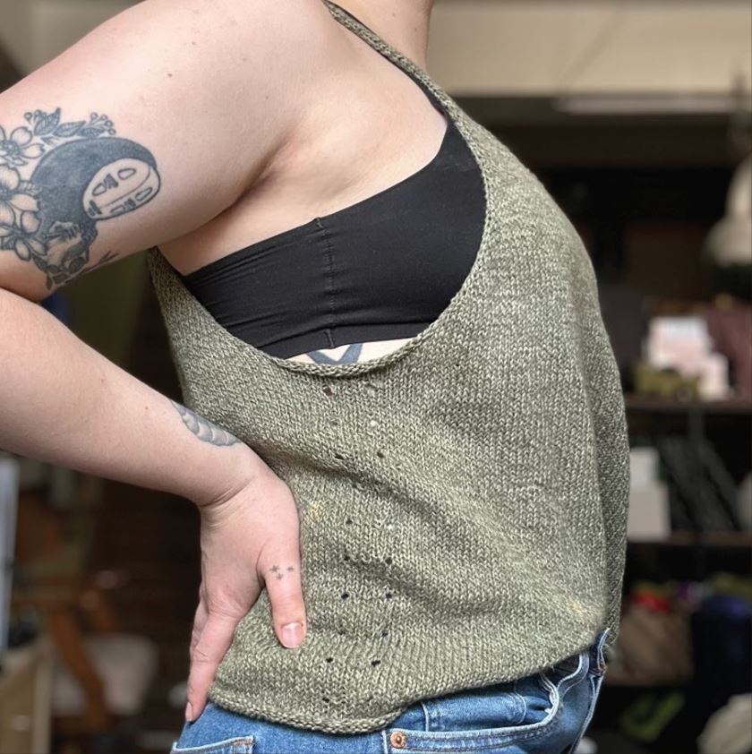 Week 4: Strap-tastic! Use the provisional cast-on to knit your straps on one panel and kitchener stitch to graft them onto the other.