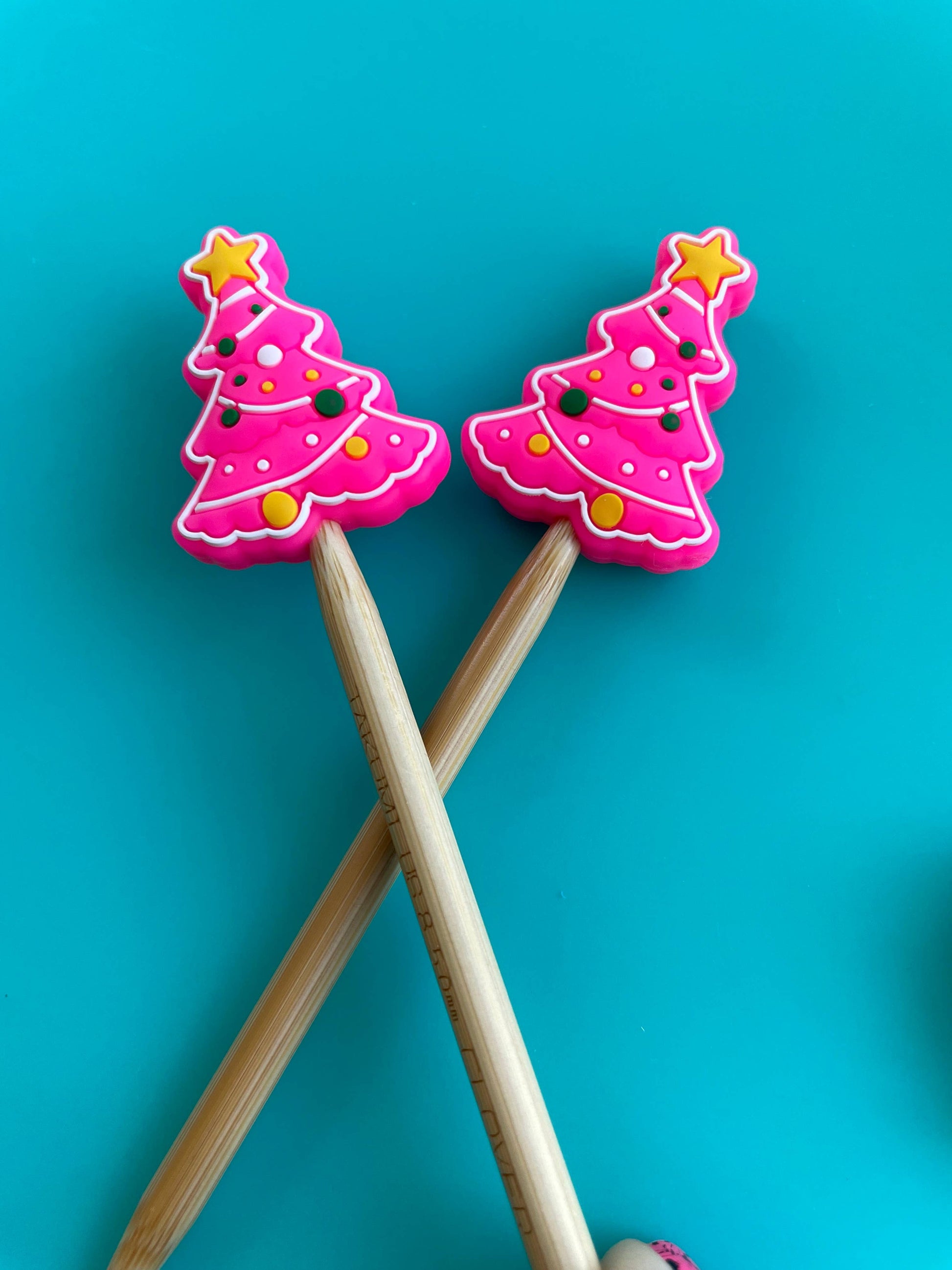 Comma Craft Knitting Needle Point Protectors - Pink Christmas tree retro