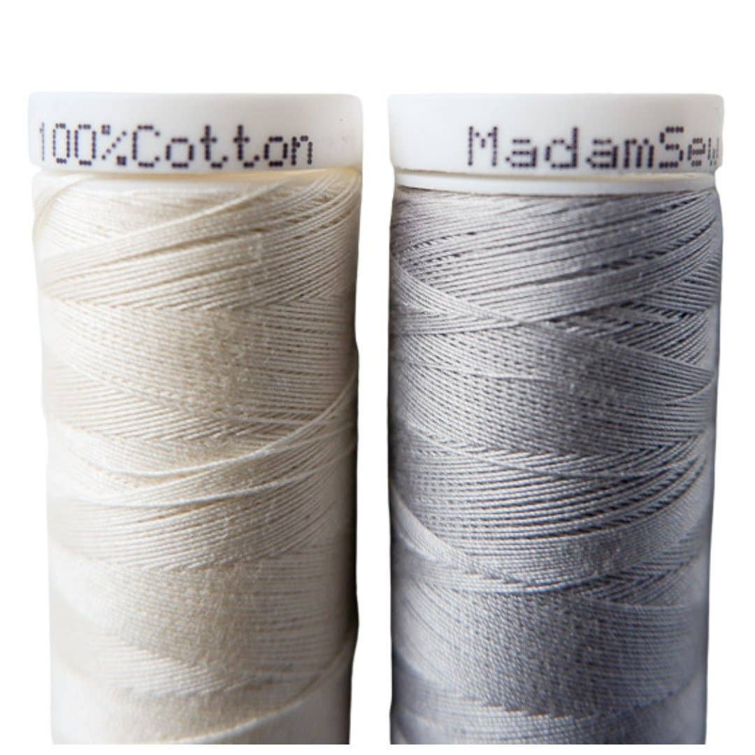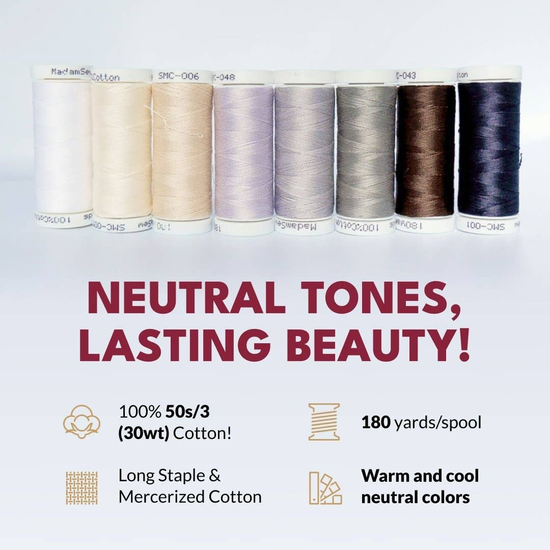 The Madam Sew, Sand & Stone, Cotton Thread Set consists of eight neutral tones that are great for quilting and sewing. These colors work well with a variety of fabric colors and prints making this a basic and versatile thread choice to add to your collection.