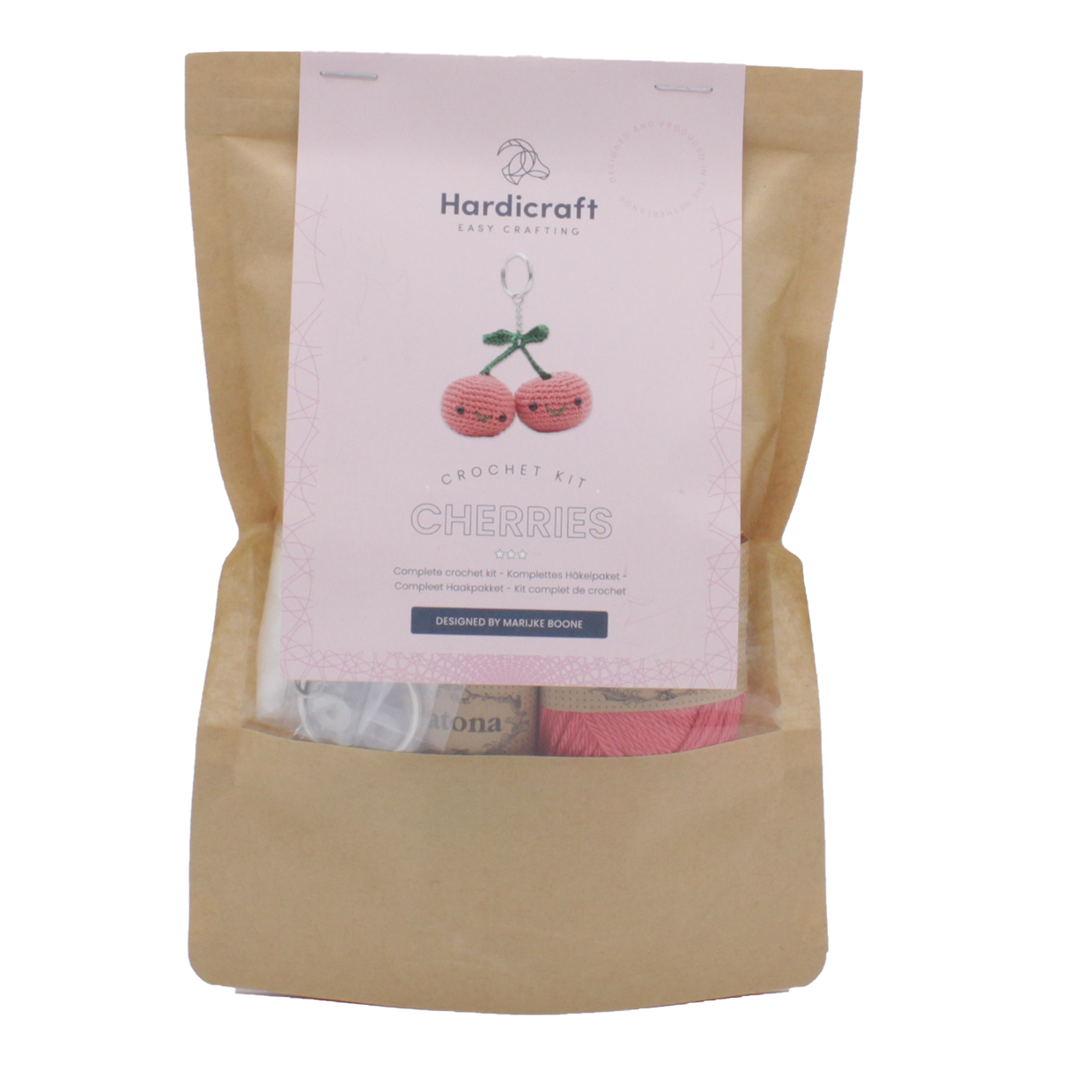 Pimp your bag with this cute Cherry bag hanger. Every (school) bag or bunch of keys needs one! This package contains a pattern, quality yarn made of 100% cotton and all the supplies needed to get started (excl. crochet hook). The Cherries are approximately 8 cm high and made with a 2.5 mm crochet hook.