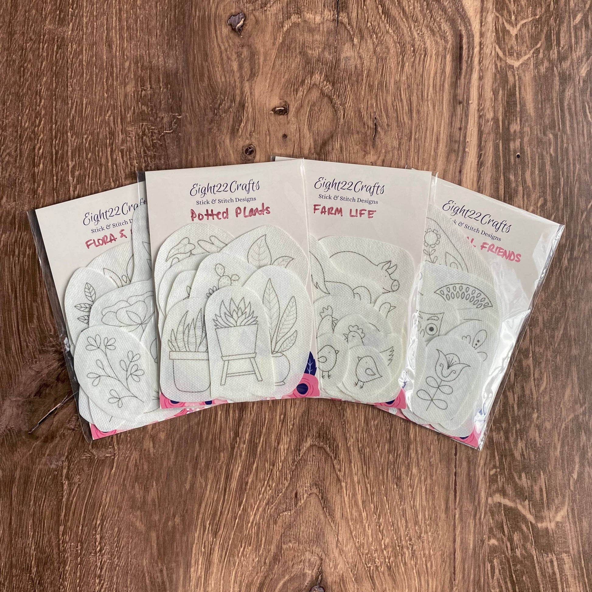 Each stick and stitch pack comes with adhesive water soluble designs that can be used to embellish clothing, bags, purses, kitchen linens, socks, etc!