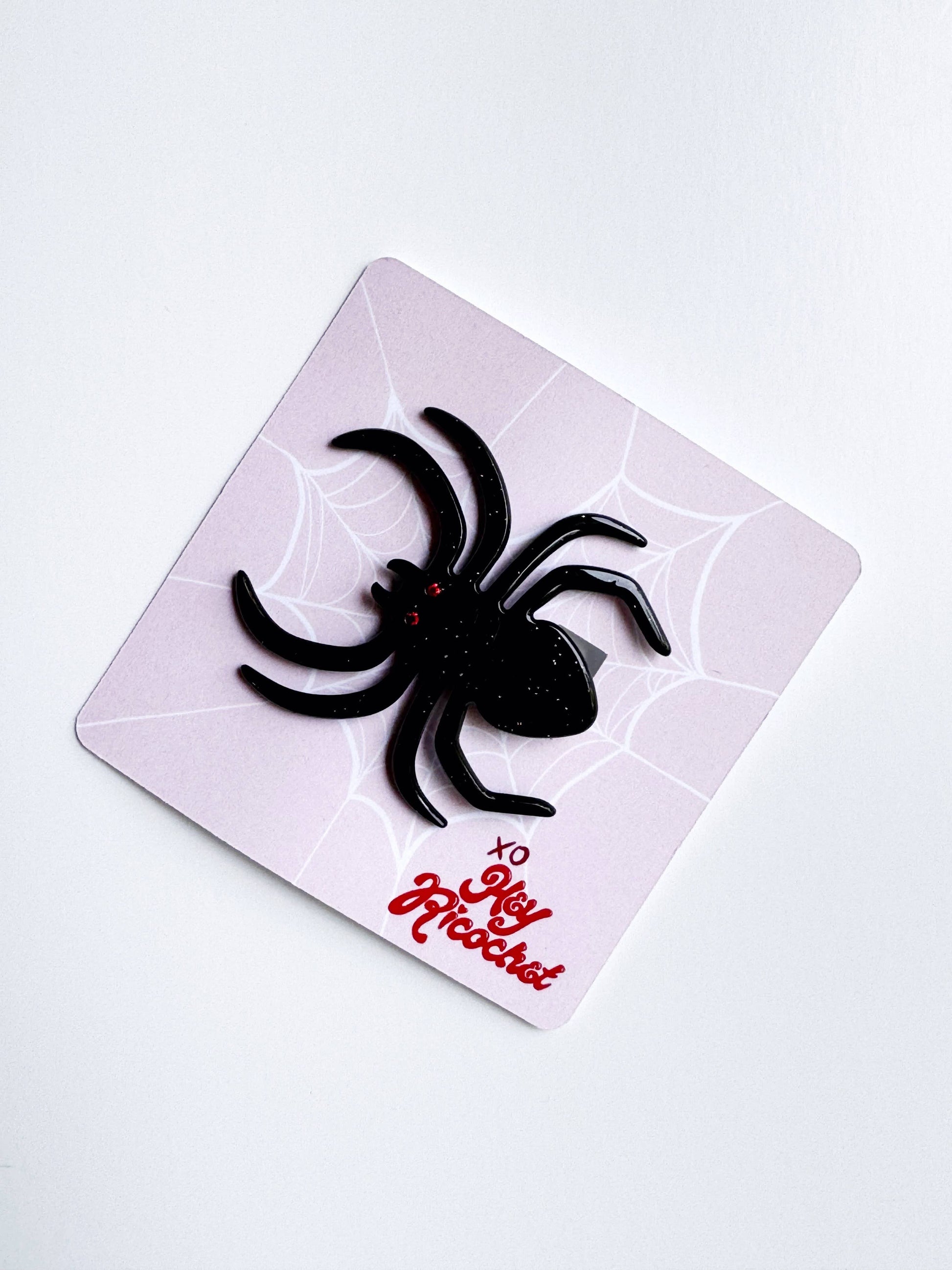 The Web Crawler clip features an intricately cut spider backed on an alligator clip. Made from glittery black acetate with sparkly red gem eyes, it's the right pop of spooky all year long. * 2.5 inches long Designed in Austin, Texas and responsibly made in China, the Clip is hand spliced together from plant-based cellulose acetate. Due to the nature of the materials and process, each piece is unique and small variations will occur.