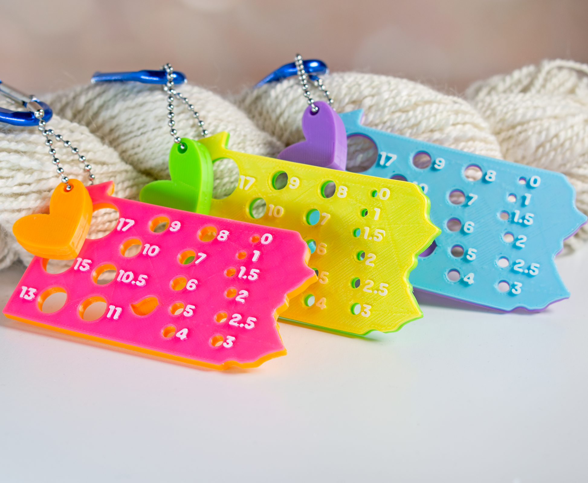 Each needle gauge comes with a matching magnetic needle minder and hangs on a carabiner. Needle gauges feature US needle sizes.