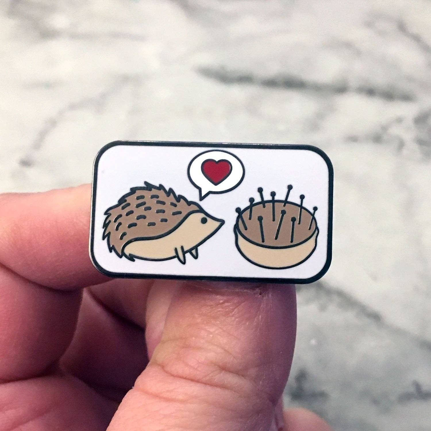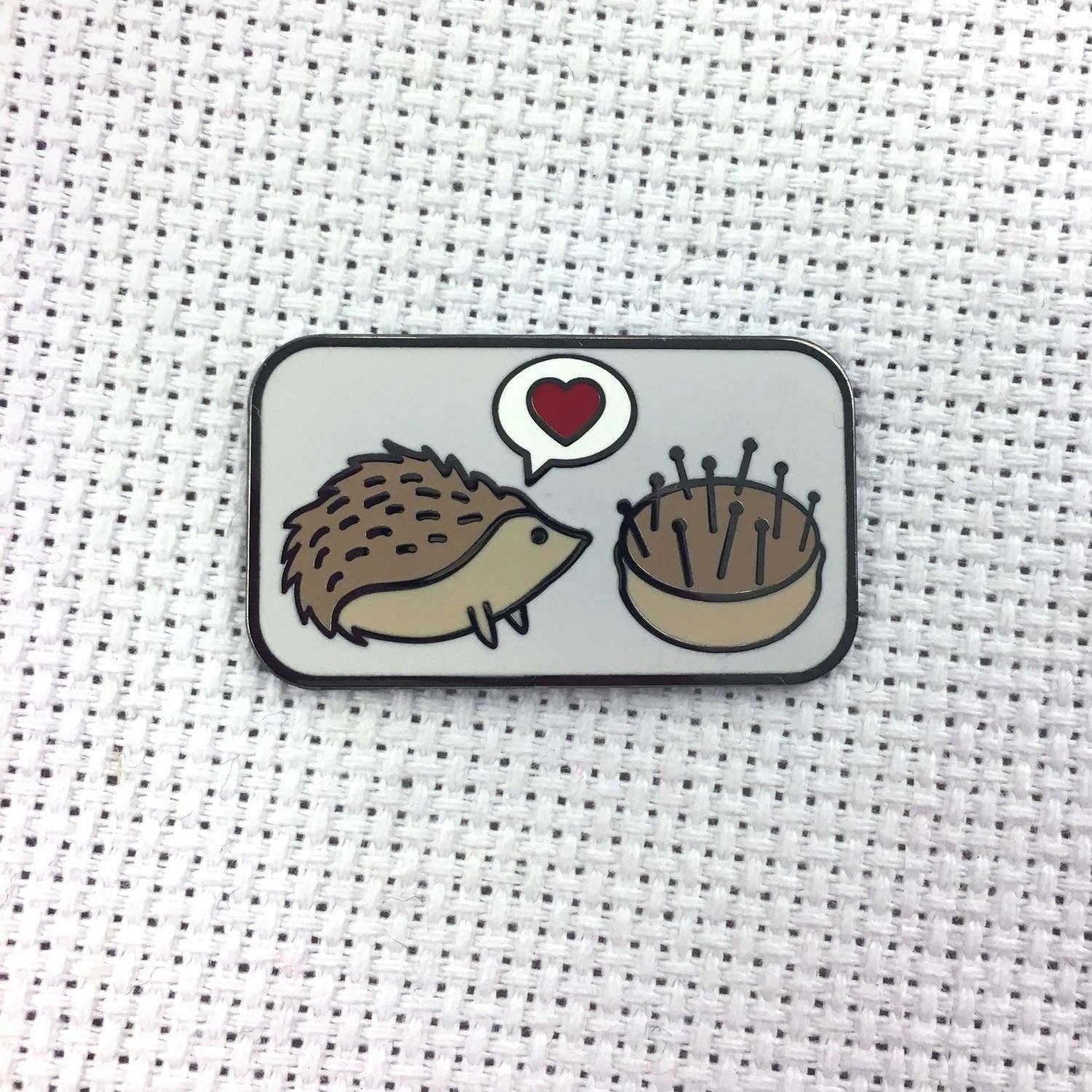 An original Snarky Crafter Designs hard enamel needle minder featuring an adorable hedgehog who doesn't realize he's fallen in love with a pin cushion. High polished black chrome with a tan and brown hedgie on a light purple grey background.