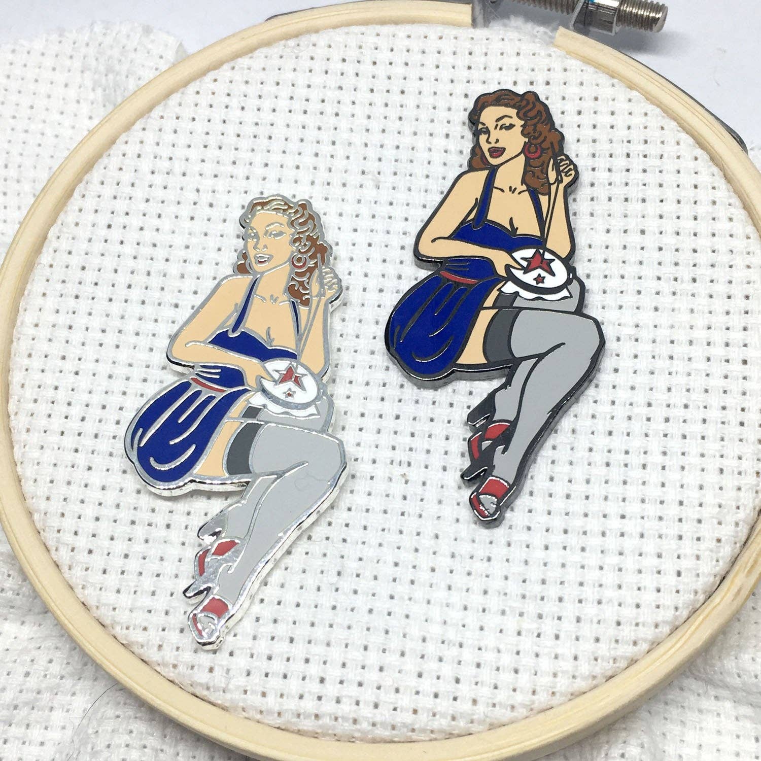I had these needle minders custom made JUST for my shop! Featuring a vintage American traditional style pin up girl with an embroidery hoop and needle and thread. Straight out of the pages of a retro calendar girl in her red, white and blue dress.