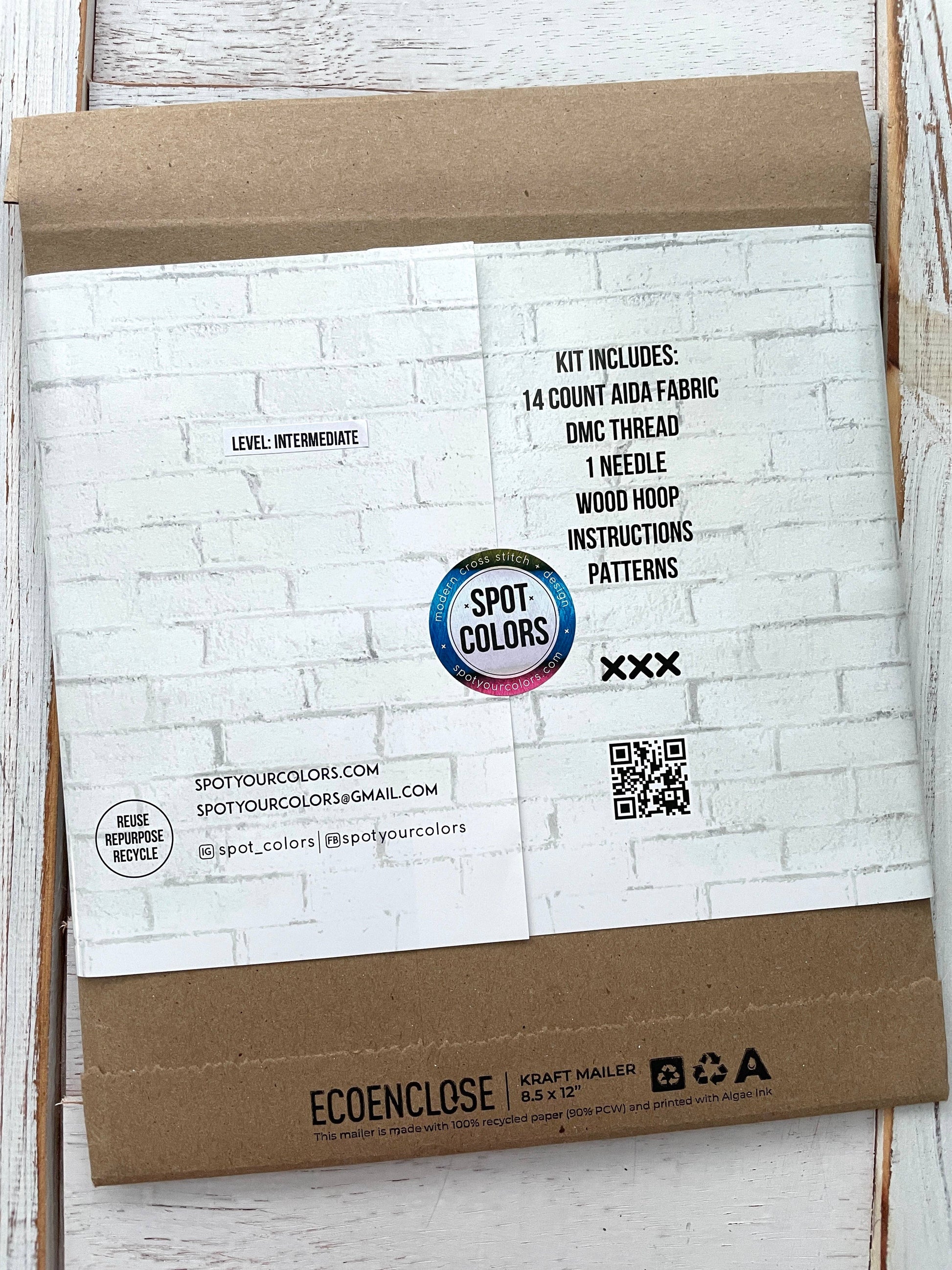 End Design fits 6” hoop Level: Intermediate. Each cross stitch includes: pattern & instructions, Aida 14 count fabric, DMC threads, 1 DMC needle, wood hoop.
