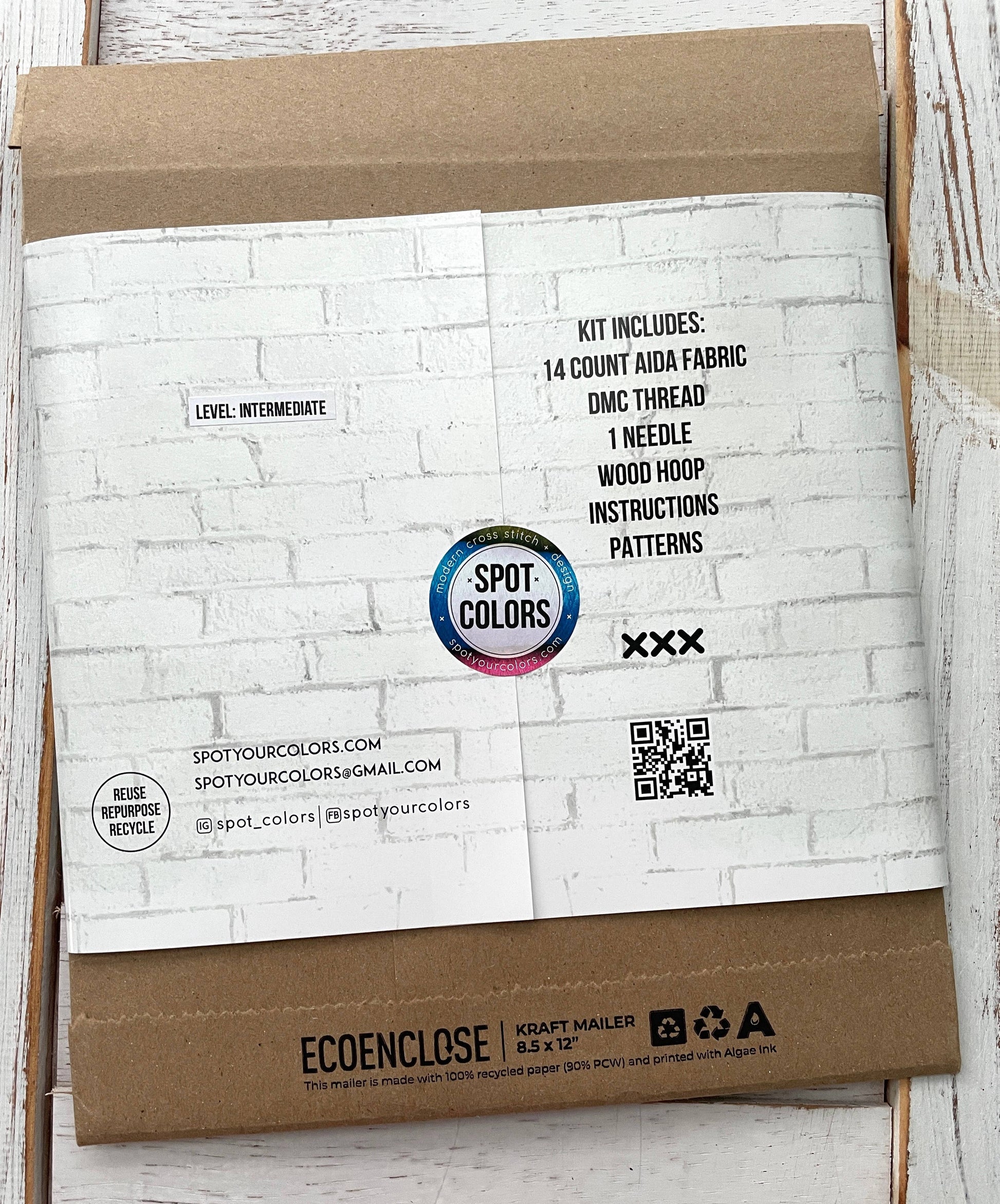 End Design fits 6” hoop Level: Intermediate. Each cross stitch includes: pattern & instructions, Aida 14 count fabric, DMC threads, 1 DMC needle, wood hoop