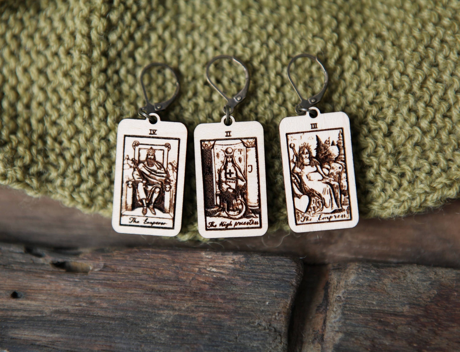 Tarot Cards Removable Knitting Progress Keepers And Crochet Stitch Markers. Set Of 3 Of The High Priestess, The Empress And The Emperor These Tarot card progress keepers are made from maple wood and are lightweight and easy to use. These removable stitch markers come in a set of three of The Holy Trinity: The High Priestess, The Empress and The Emperor. The bronze leverback open clasps make it easy to place anywhere on your project to mark your knitting or crochet rows, increase or decrease points and to place when needing to measure a certain length from the beginning of a point.