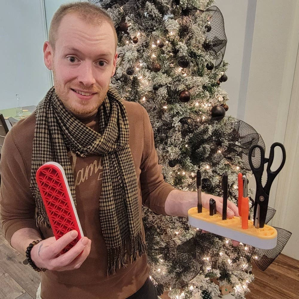 The white bottom of this stash & store organizer is made of sturdy plastic and the colored top and inside is made of flexible silicone. These silicone pockets hold your tools in an easy-to-grab upright position and the caddy won’t topple over.